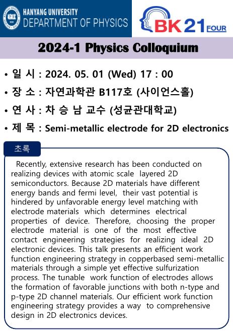 [2024-1 콜로키움] 2024년 05월 01일 17:00, 차승남 교수 (성균관대학교)