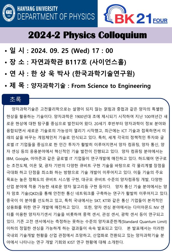 [2024-2 콜로키움] 2024년 09월 25일 17:00, 한상욱 박사 (한국과학기술연구원)