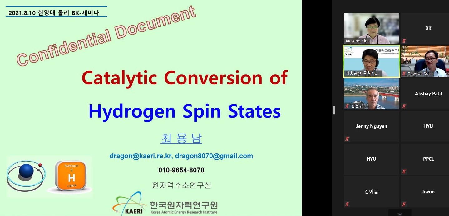 수소 분자는 두 가지 스핀 이성질체[ortho-H2 (I=1) & para-H2 (I=0)]가 존재하는데, 상온에서 75%에 이르는 ortho-H2를 액체 상태인 극저온(20K, -253℃)에서 1 % 내외가 되도록 하는 상전환 공정이 필수적으로 요구된다. 상전환 공정 없이 액화된 수소는 완벽한 단열조건 속에서도 느리게 진행되는 자발적 ortho-to-para 상전환에 의해 전체 액체수소의 64%를 기화시켜 손실을 유발하는 문제가 있다. (상전환열 ~ 1.59 × 기화열) 상용 액화플랜트에서 사용되고 있는 상전환 촉매는 Molecular Products 사의 IONEX® 라는 세라믹(산화철) 촉매가 유일한 상용촉매이다. 전이금속 산화물에 의한 촉매는 전이금속 근처에 도달한 수소분자 내의 양성자 핵 스핀이 자기장에 의해 뒤집히는(flip) 방식으로 상전환이 이루어진다. 본 연구팀에서 제안하는 수소 상전환 방식은 비공유 전자쌍을 갖는 전이금속 이온이 포함된 MOF 소재에 의한 것으로, 전이금속의 d-궤도 전자와 배위결합 된 수소분자의 s-궤도 전자와의 혼성 궤도함수를 통한 스핀-궤도 상호작용에 의한 상전환 방식이다. 본 세미나에서는 관련된 실험결과와 함께 상용급 액화 플랜트에 적용했을 경우의 기대효과를 제시할 예정이다.