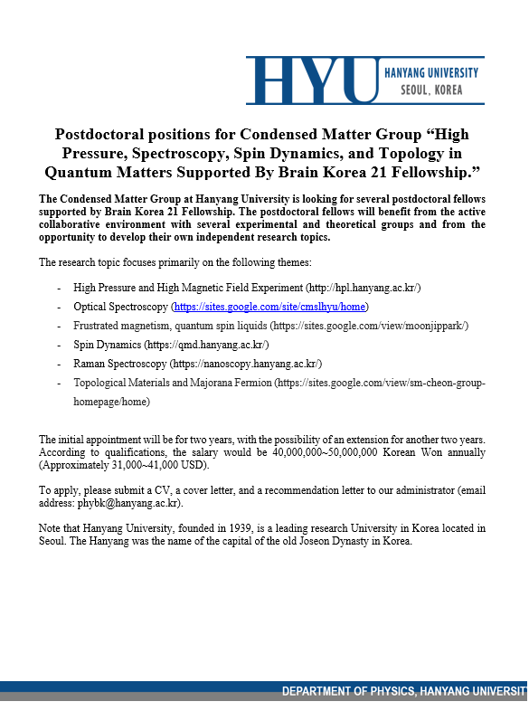 한양대학교 양자물질 극한물성 교육연구팀에서는 소속 연구실에서 다양한 연구를 진행할 박사후연구원을 아래와 같이 초빙하고자 합니다.