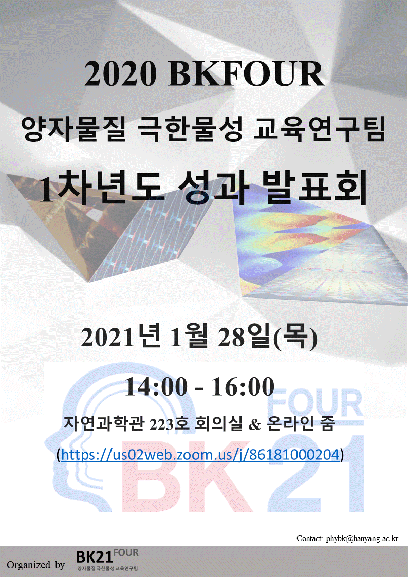 물리학과 BK 양자물질 극한물성 교육연구팀의 1차년도를 정리하는 성과발표회를 아래와 같이 개최합니다.